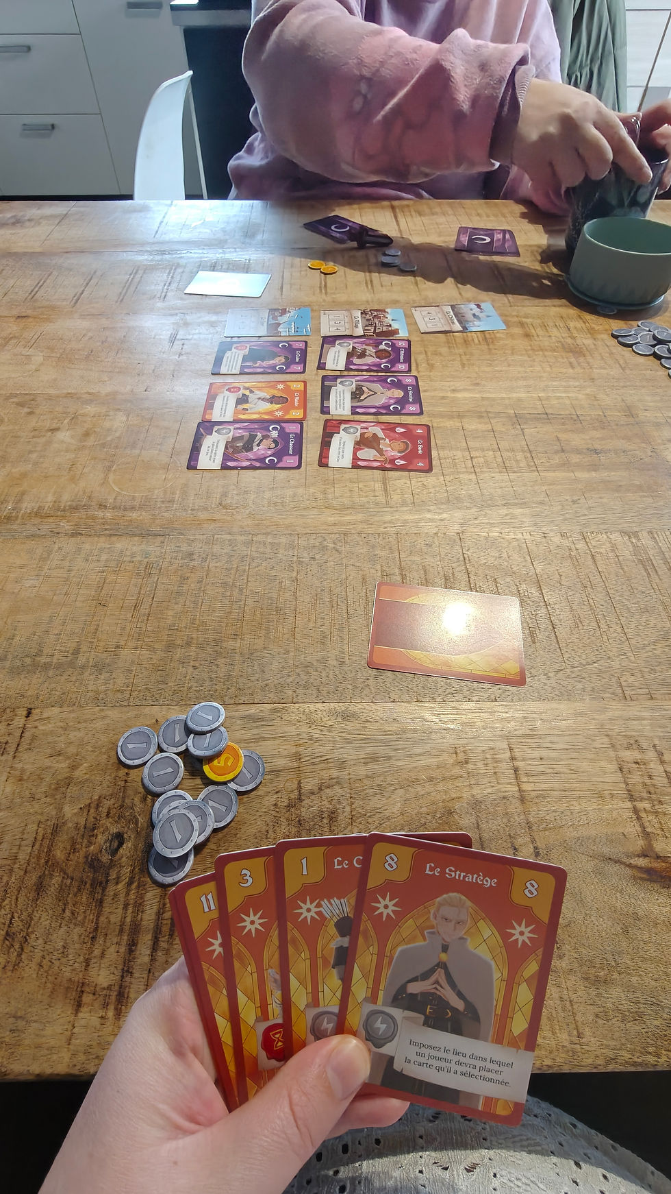 De plus, le système de choix simultané des cartes, suivi du placement à l’un des trois lieux, installe une tension permanente. On observe les autres, on tente de deviner leurs intentions, on se demande : “Va-t-il jouer haut ? Va-t-elle me contrer ? Est-ce que je tente un coup risqué ou je sécurise un petit point ?”. Entre anticipation, bluff et ajustement de dernière minute, chaque décision compte, et presque toujours, quelqu’un finit par râler gentiment d’avoir été doublé au dernier moment. C’est précisément cette petite dramaturgie stratégique qui rend le jeu aussi vivant.